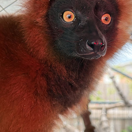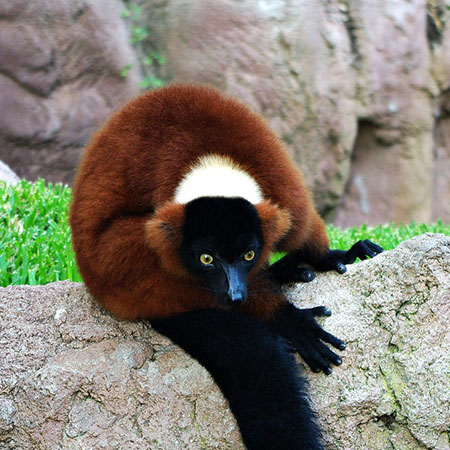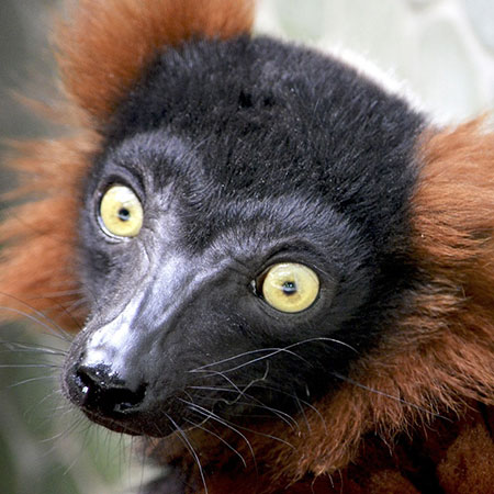 The red ruffed lemur is a stunning and charismatic primate, recognized by its thick, reddish-brown fur and distinctive black face with a fluffy ruff around its neck. Native to the rainforests of Madagascar, these arboreal lemurs spend most of their lives in the treetops, leaping gracefully between branches in search of food.